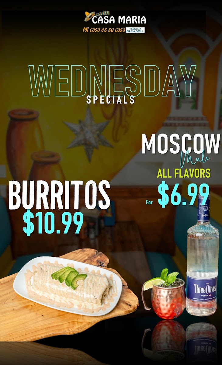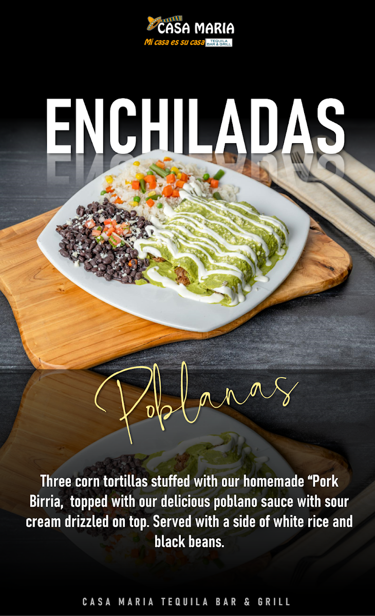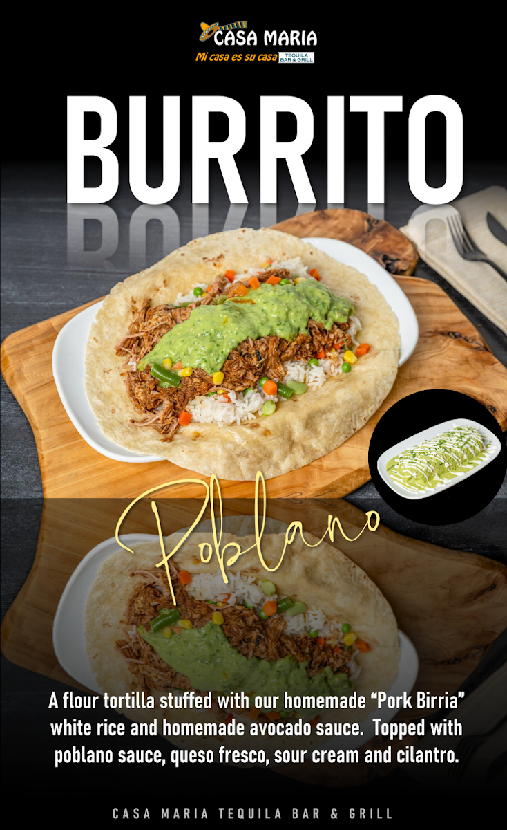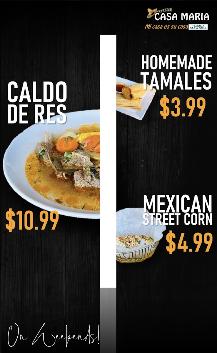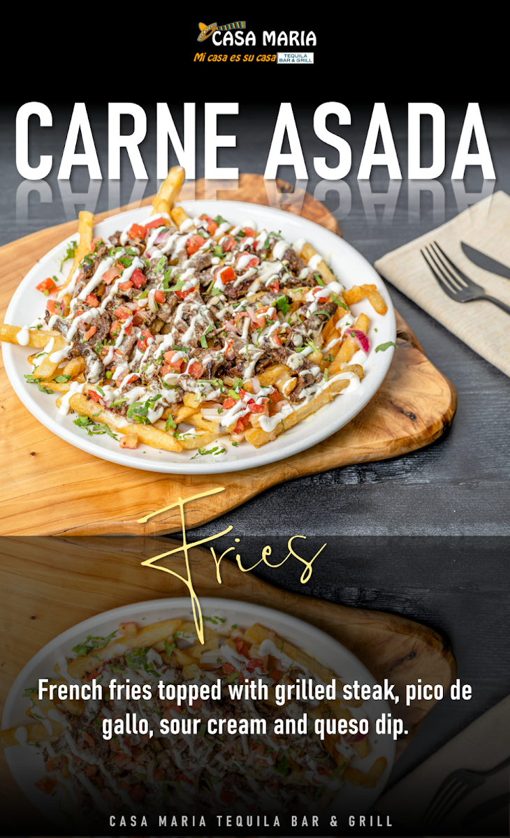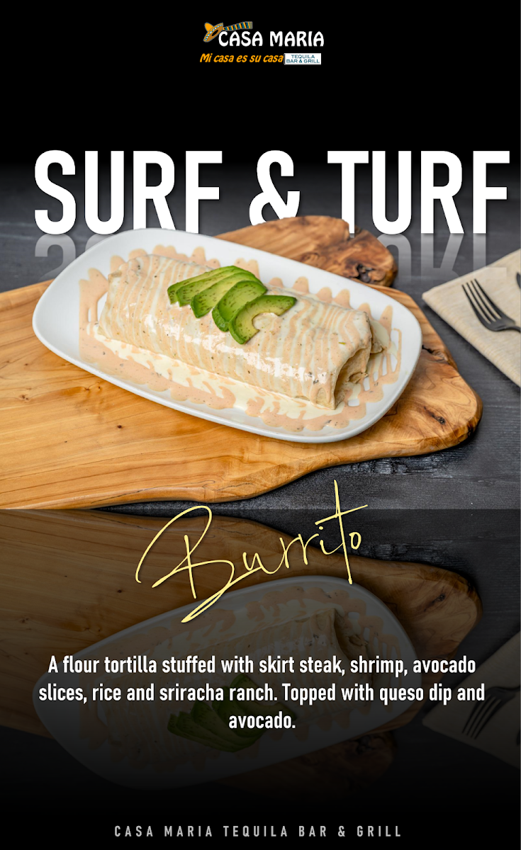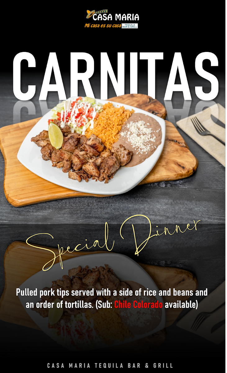 Casa Maria Tequila Bar & Grill offers a delightful selection of authentic Mexican dishes that cater to both classic tastes and more adventurous palates. A standout appetizer is the Cheese Dip, a creamy, savory dip perfect for sharing, which pairs wonderfully with their crispy tortilla chips. For those looking for a refreshing drink to accompany their meal, the restaurant's famous 32oz Margarita Jug is an absolute must-try. This oversized margarita offers the perfect balance of tart and sweet flavors, ideal for enjoying with friends. The menu also features a variety of flavorful tacos, sizzling fajitas, and hearty burritos, all made with fresh ingredients and bold seasonings. Whether you're in the mood for a casual bite or a festive meal, Casa Maria delivers an enjoyable dining experience with generous portions and vibrant flavors that transport you straight to Mexico.